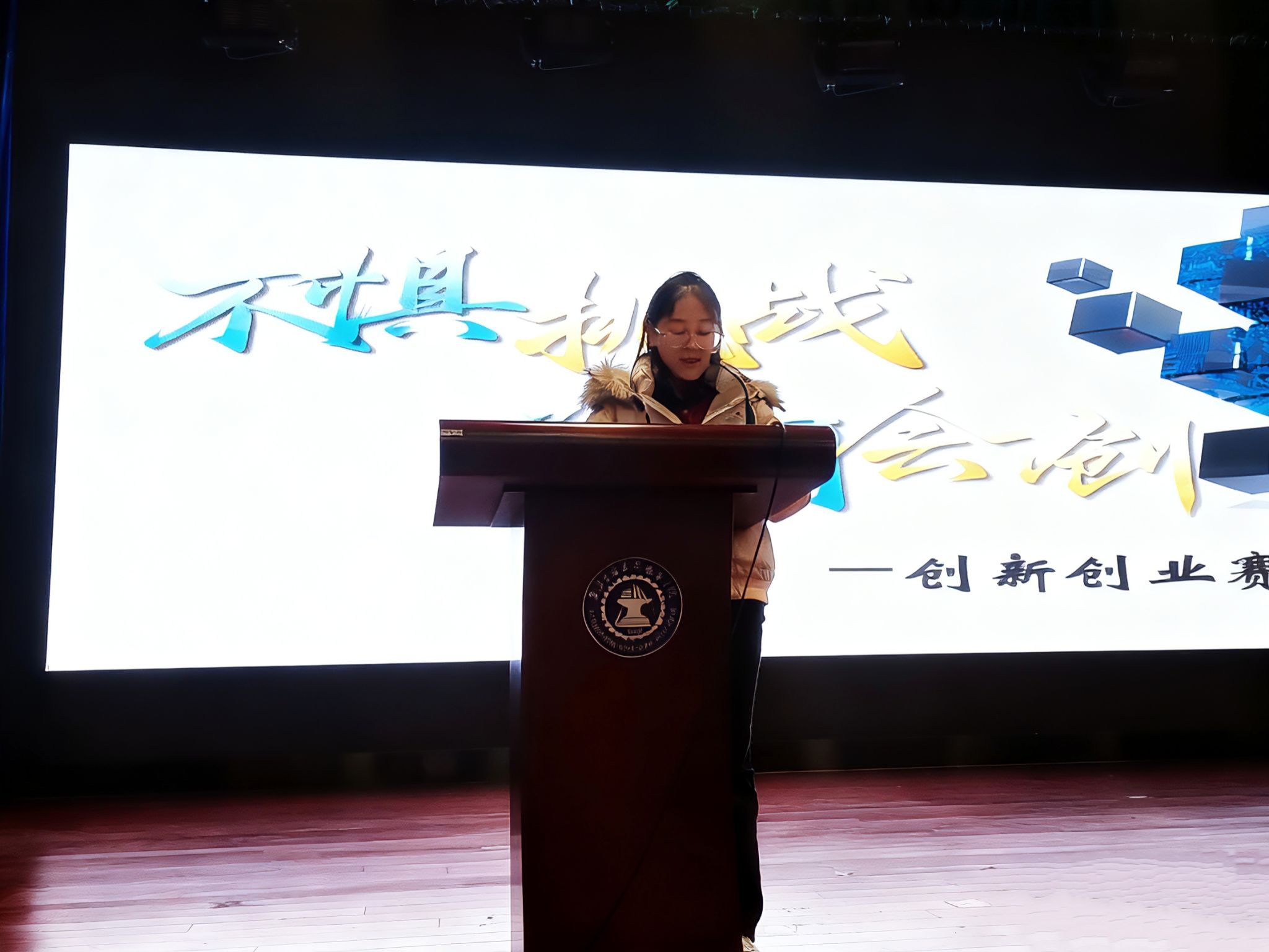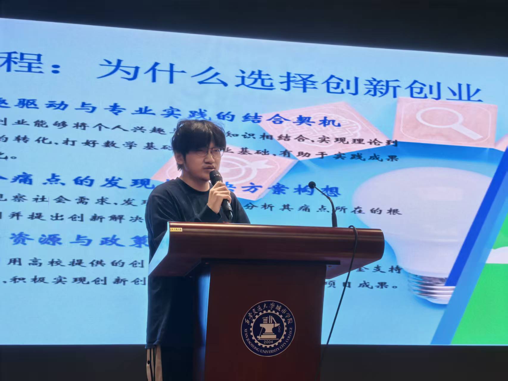 在经验分享环节,往届竞赛获奖代表许金涛作为低年级参赛代表发言。他结合自身经历,分享了选择创新创业的初衷、项目推进的核心历程,以及在这一过程中的成长蜕变与收获成果,其生动的分享为低年级学生参与双创提供了宝贵参考,进一步点燃了现场学生的参赛热情。