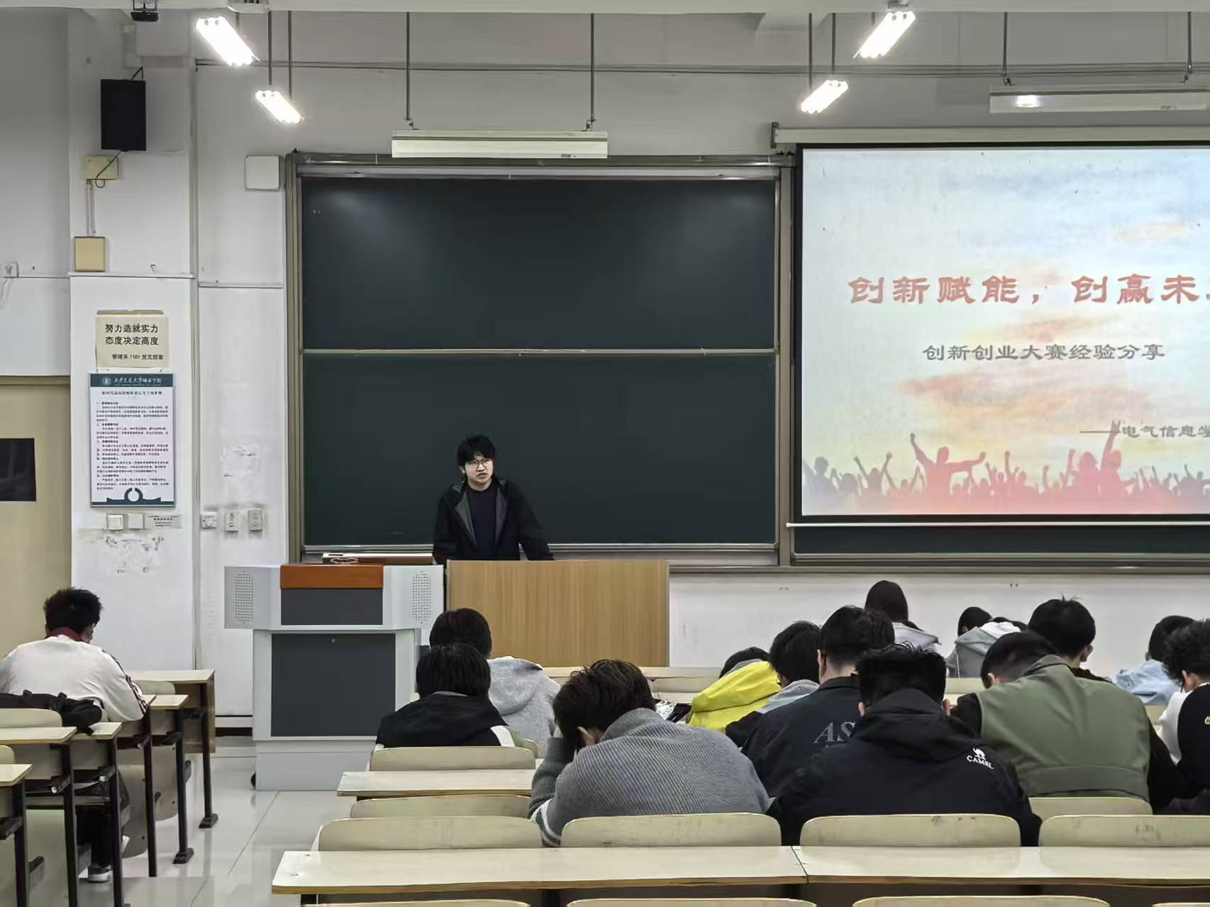 为营造浓厚的校园创新创业竞赛氛围,帮助2025级学生明晰科创赛事路径,电气信息学院2026年4月8日在2025级晚自习教室,举办创新创业竞赛经验分享会。本次分享特邀国创比赛获奖学生周晨晋和许金涛担任主讲嘉宾,以朋辈视角为新生传授实战经验。